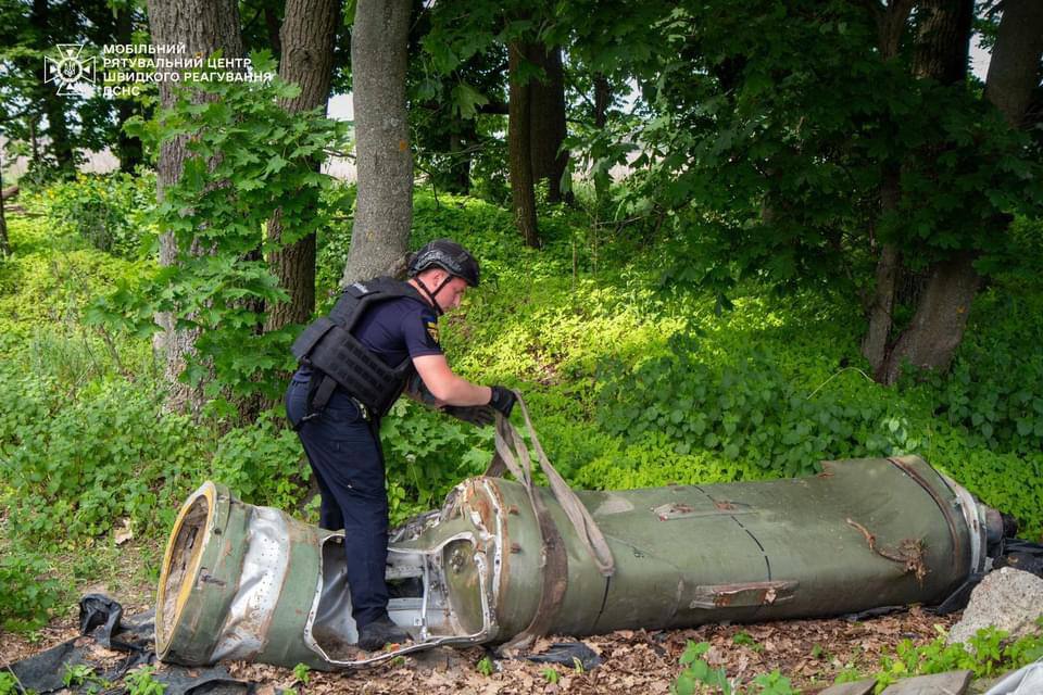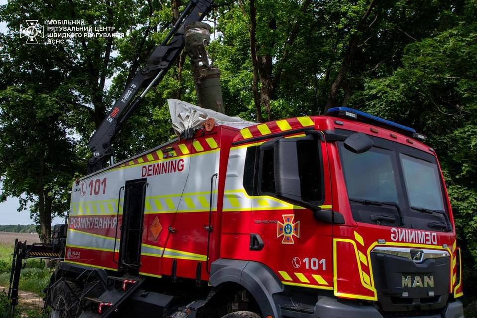 In the residential area of the village of Kryukivshchyna, the remains of a “Tochka-U” tactical missile system were removed. Our Heavy Pyrotechnic Vehicle (PM-V) was indispensable here. The dangerous items were loaded into a special armored compartment using a hydraulic manipulator and then transported to a special site for further disposal.