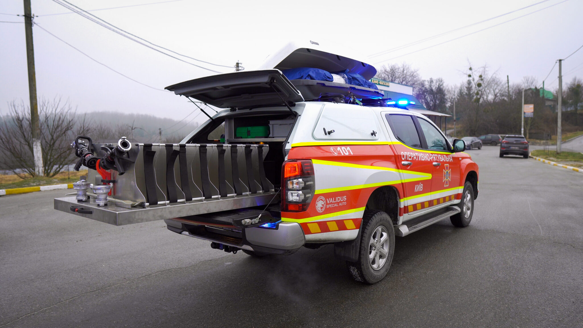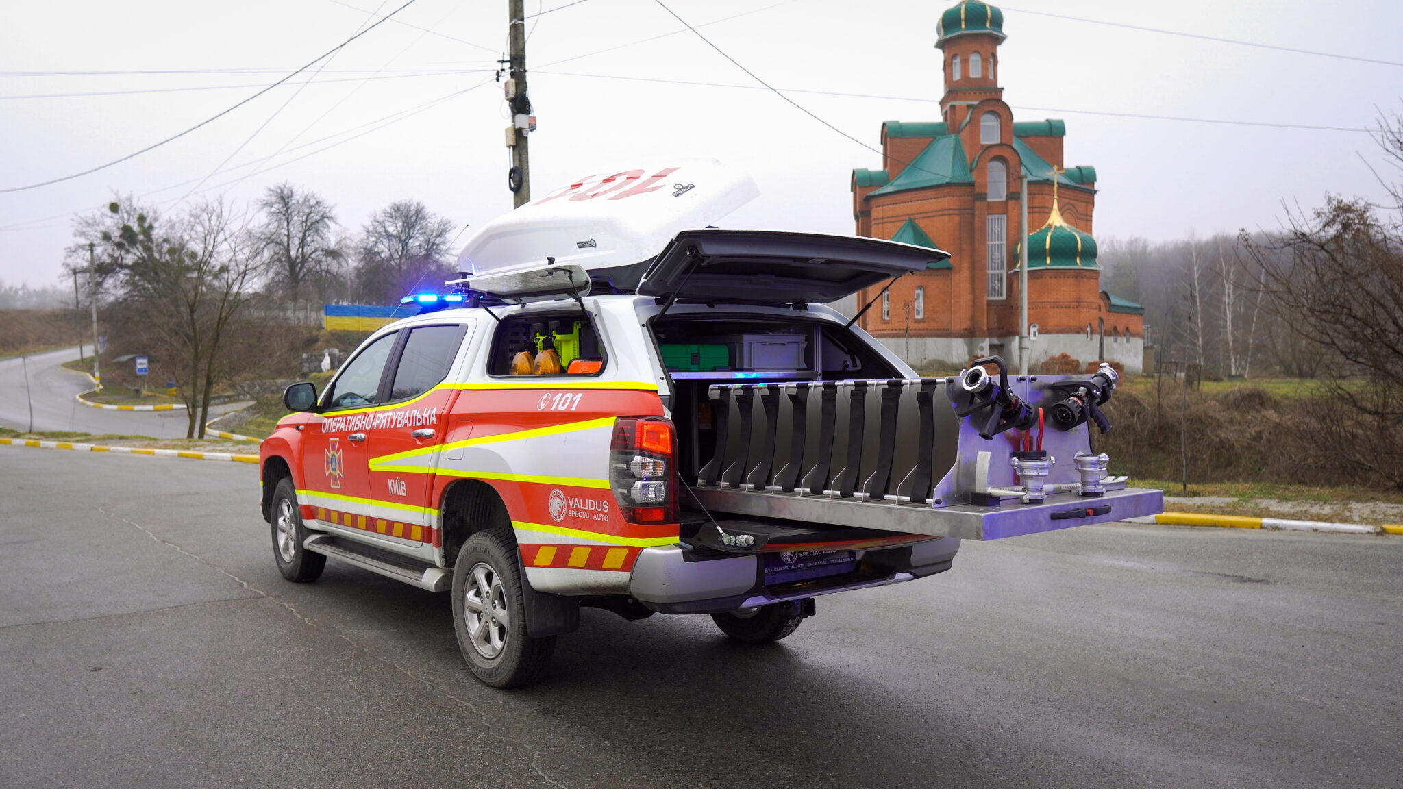 A unique vehicle based on the Mitsubishi L200, designed for the rapid and mobile delivery of a fire and rescue robot, a task force and special equipment that ensures the robot's operation.