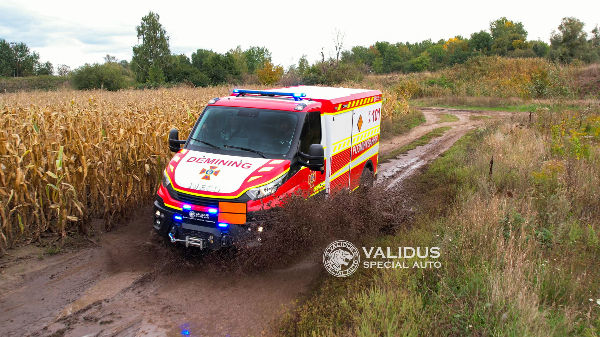 A special vehicle constructed on the basis of off-road cargo and passenger vehicles and designed to transport special property and equipment, support demining operations and further transport small-calibre explosive ordnance to the site of destruction.