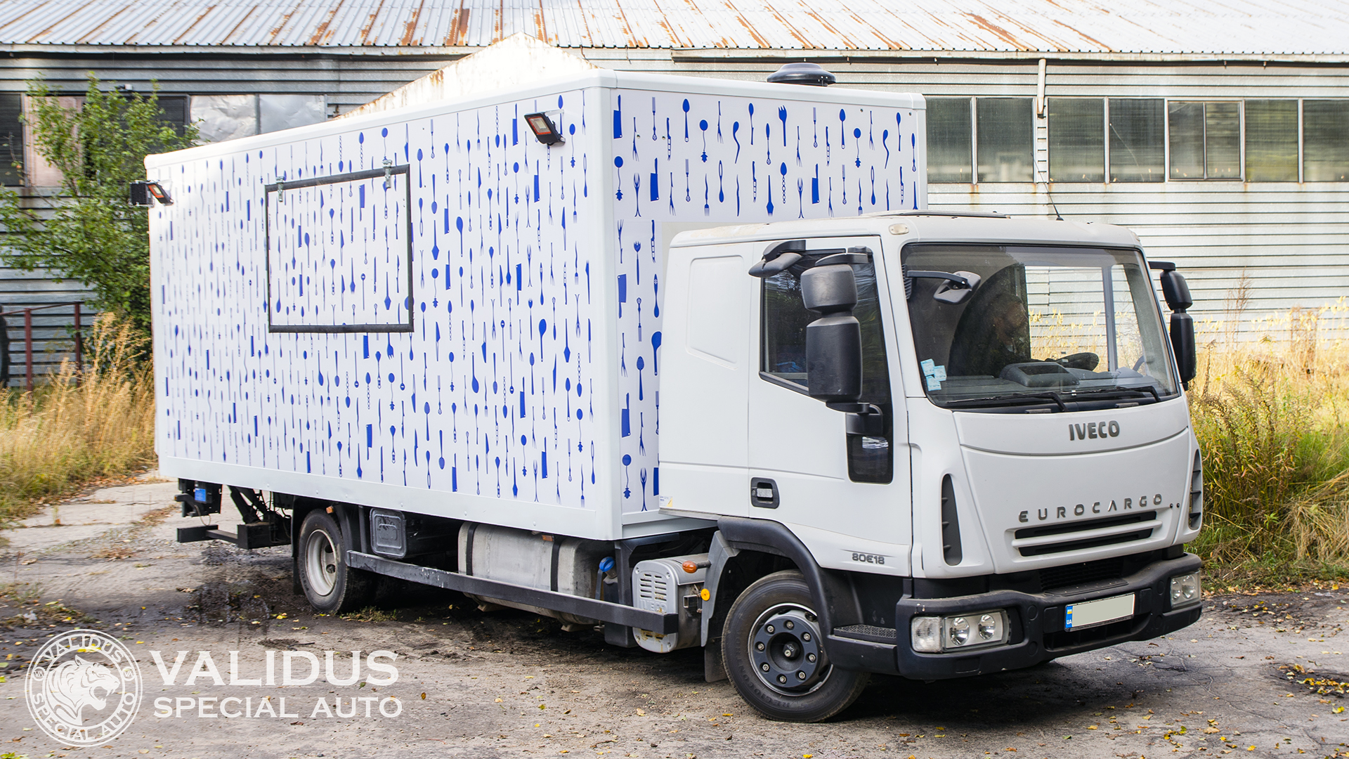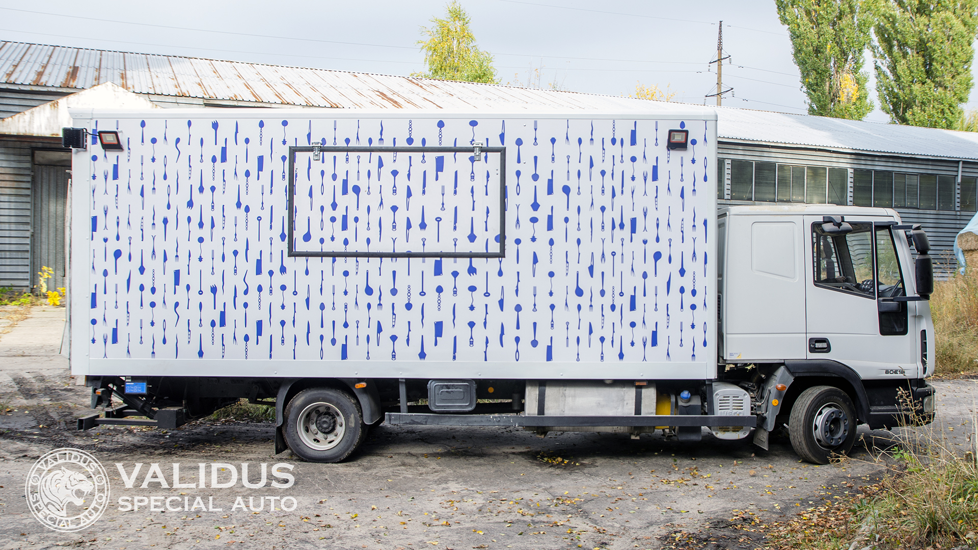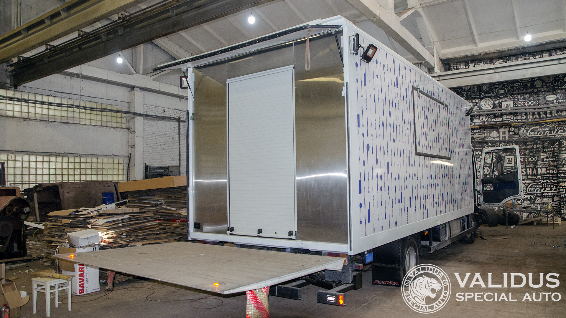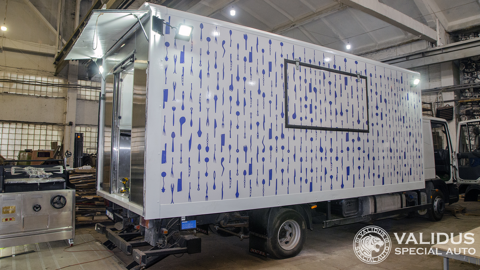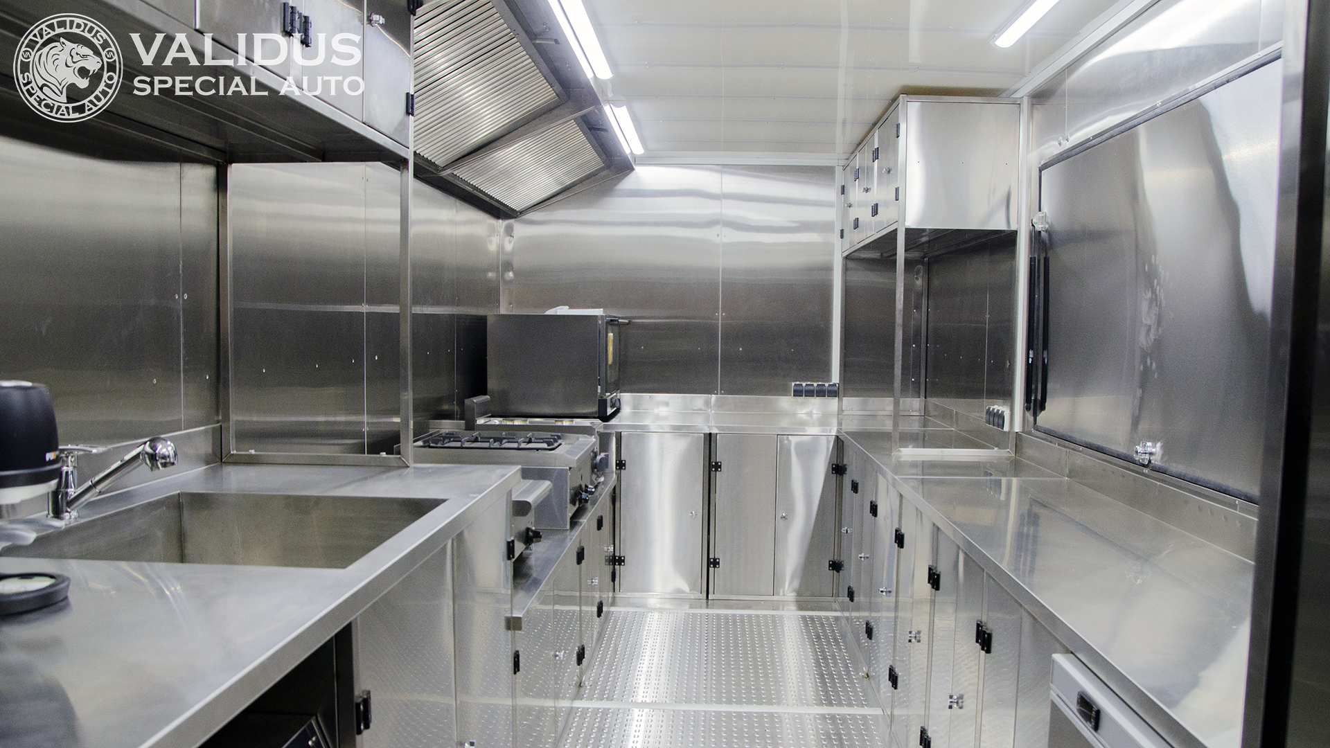 Мобильная кухня — универсальное транспортное средство для перевозки продуктов и всего необходимого оборудования для приготовления и продажи еды на улице. Оборудованный автомобиль всем необходимым для приготовления, хранения и подачи пищи где угодно. Предусмотрены естественное и электрическое освещение, вентиляция с вытяжкой и удобное рабочее место повара.